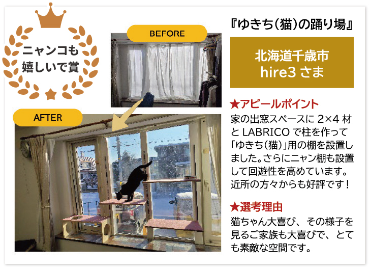 家の出窓スペースに「2×4材」と「LABRICO」で柱を作って「ゆきち(猫)」用の棚を設置しました。さらに「ニャン棚」も設置して回遊性を高めています。 通りかかる近所の方々からも好評です!