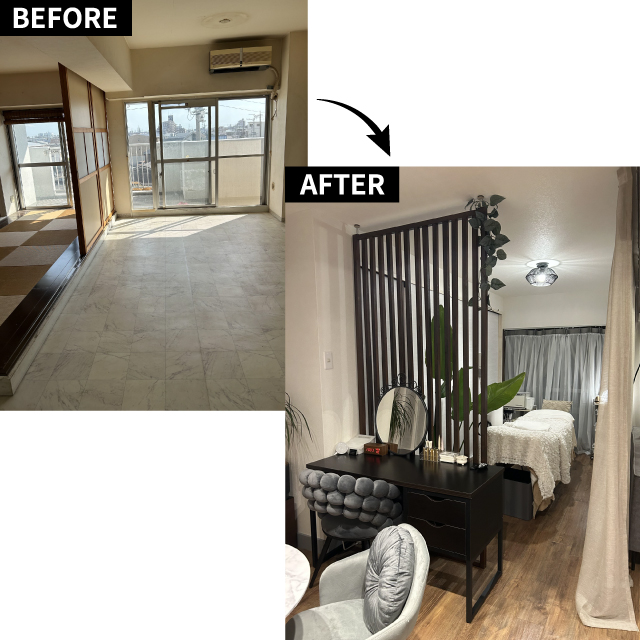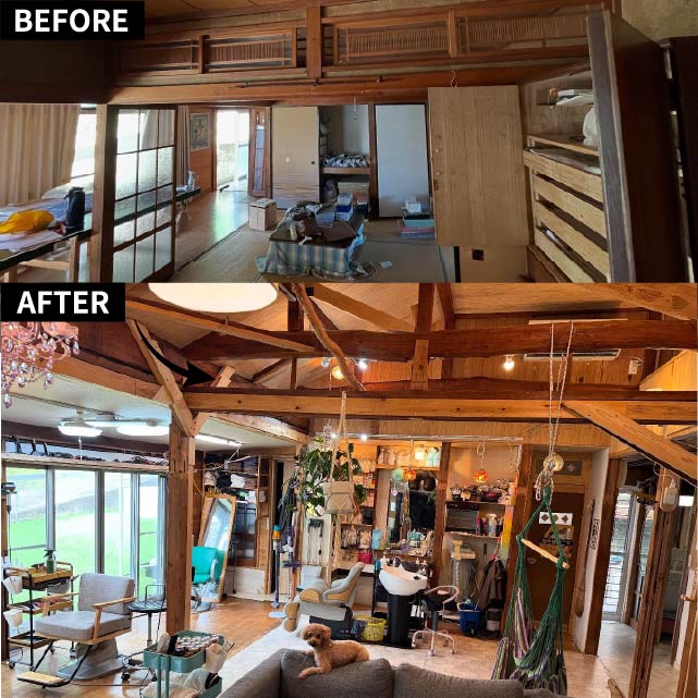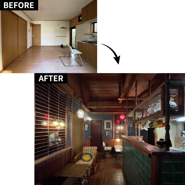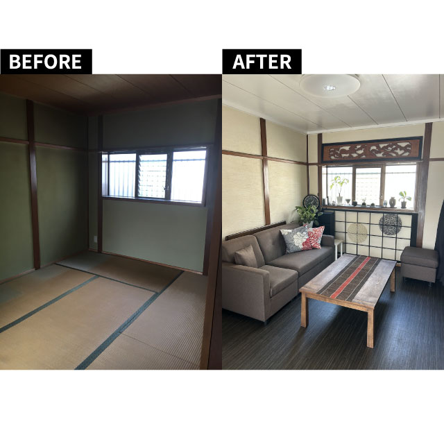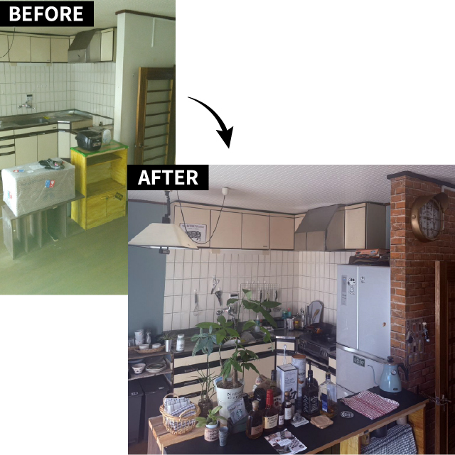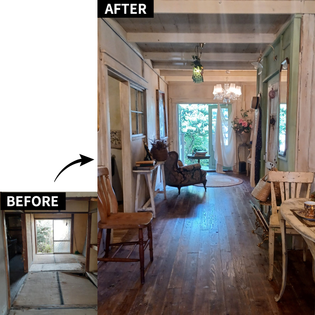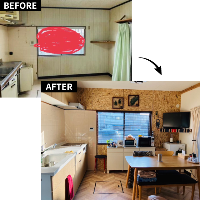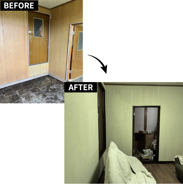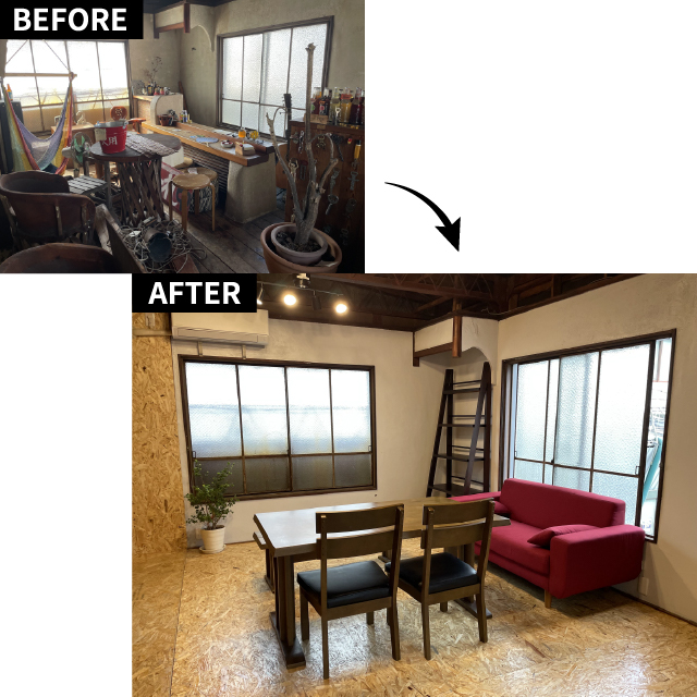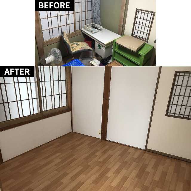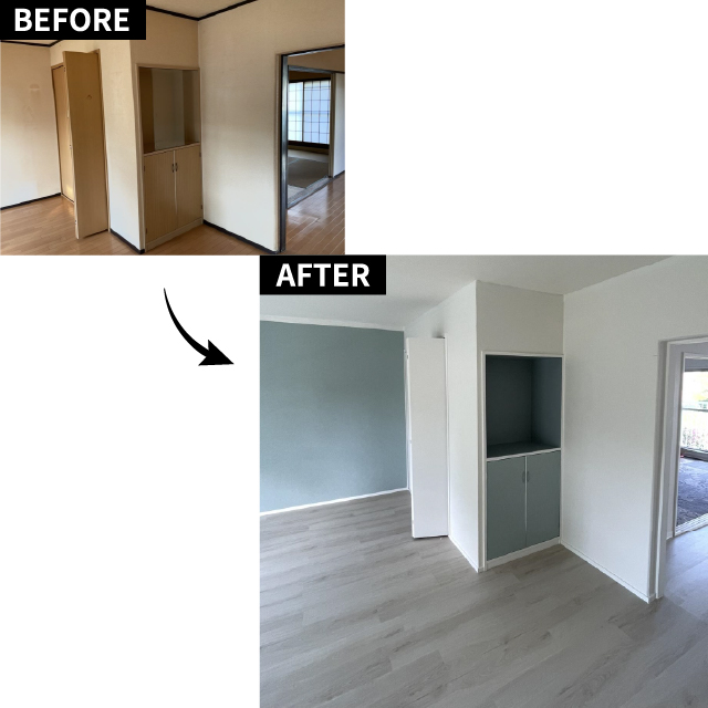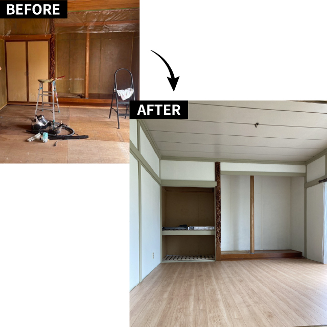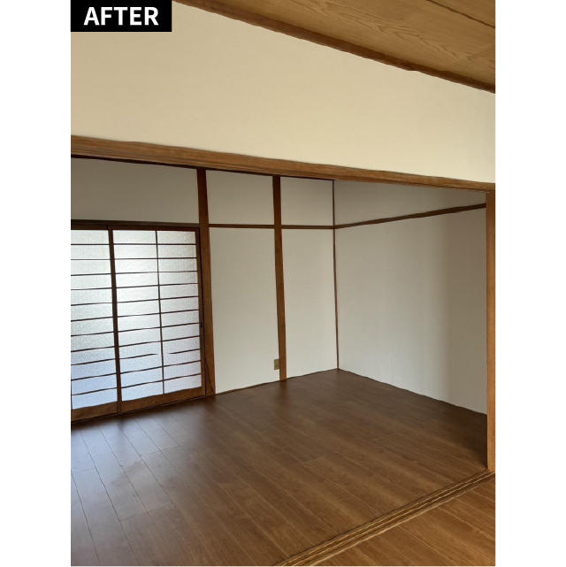 砂壁と畳も自分で撤去して、天井をペンキで塗り、壁は漆喰で仕上げ、床もフローリングを張りました 雰囲気が明るくなりとても満足です。