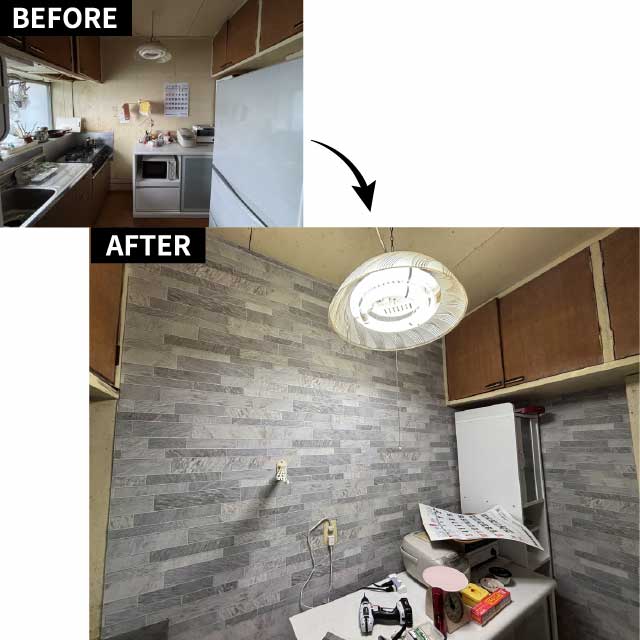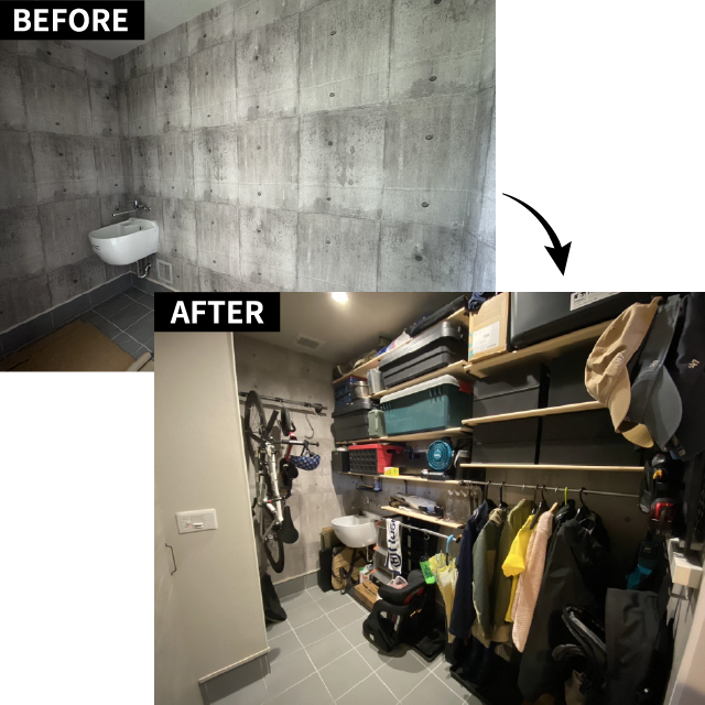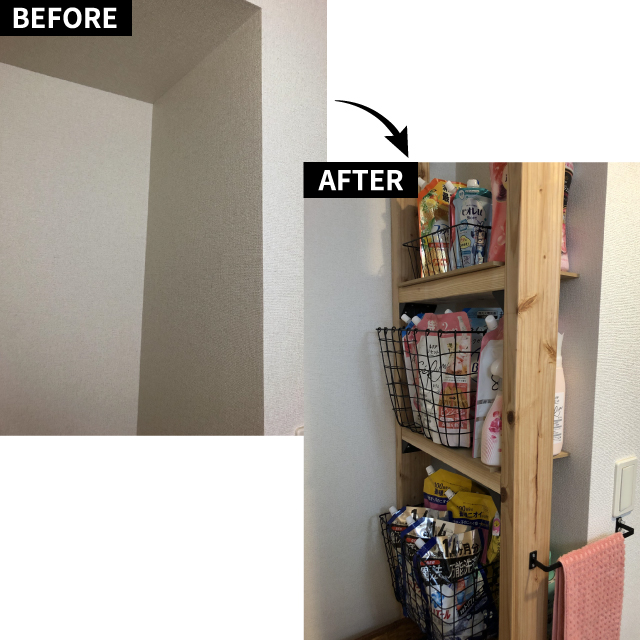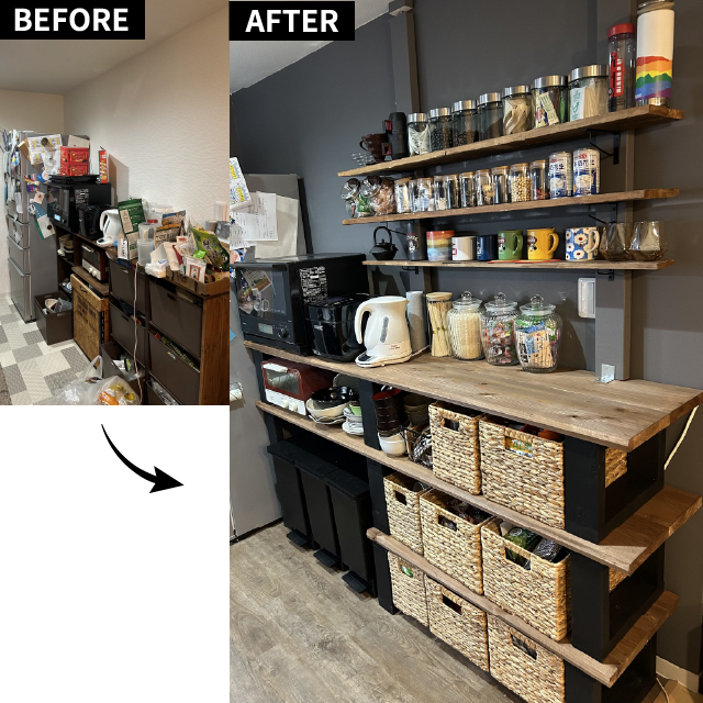 棚の雰囲気に合うように背面の壁紙を白からグレーに変更。 ディアウォールも端材を再利用。柱を目立たなくするため、壁紙を貼り一体感を出すことに成功。 カフェ板杉材を天板として使用したことで収納棚に重厚感がプラスされて垢抜け+かなり使いやすい収納棚に変身しました。