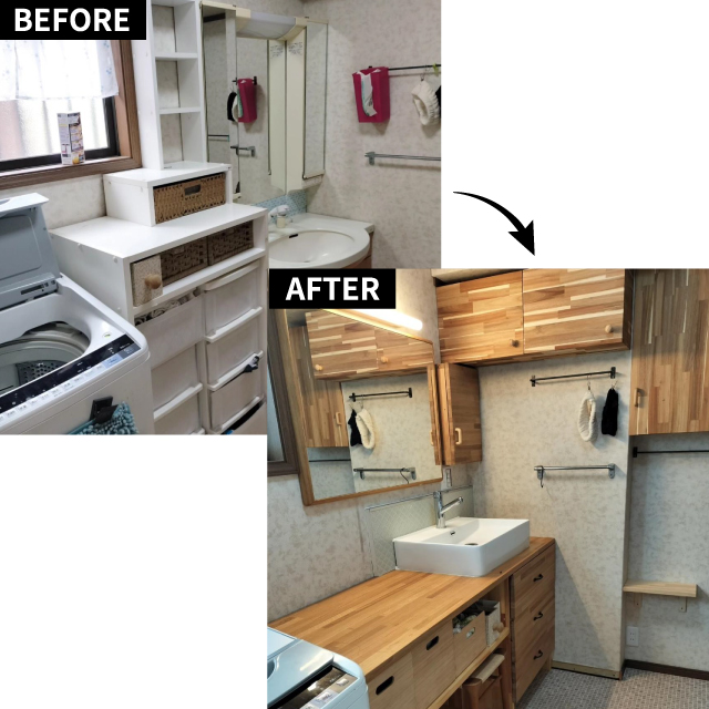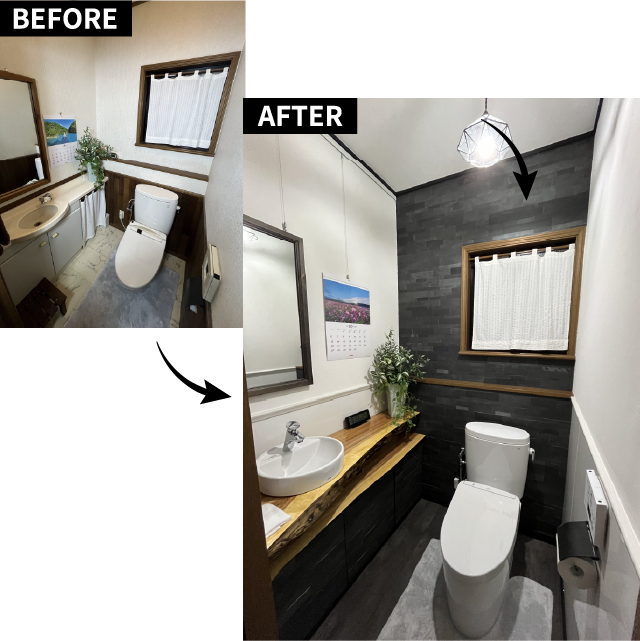 トイレ周りを全てDIYでリフォーム。手洗いカウンターは天然木板を二分して上下に配置し、塗料とウレタンニス5度塗りで仕上げました。収納部分は2x4材で枠を組み、扉は既設を切り縮めて、黒色の天然石壁紙シートを貼りました。反対側の腰壁部分は掃除のしやすさを考えてキッチンパネルを貼ってます。施工はたいへんでしたが仕上がりに自己満足してます!
