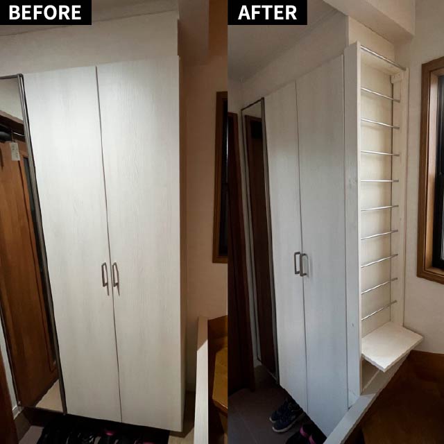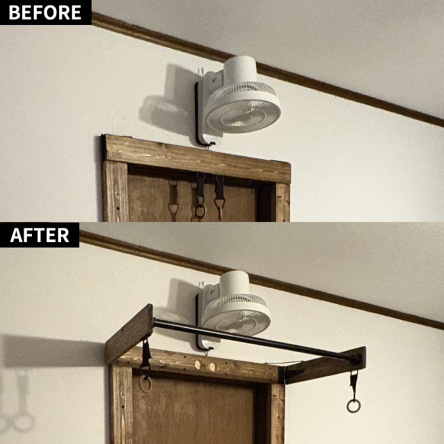 下駄箱と階段の隙間に 1×4の木材にパイプをつけて作りました。 スリッパをパイプに掛ける様に使います。 写真には写ってないですが、下に引き出しも付けています。