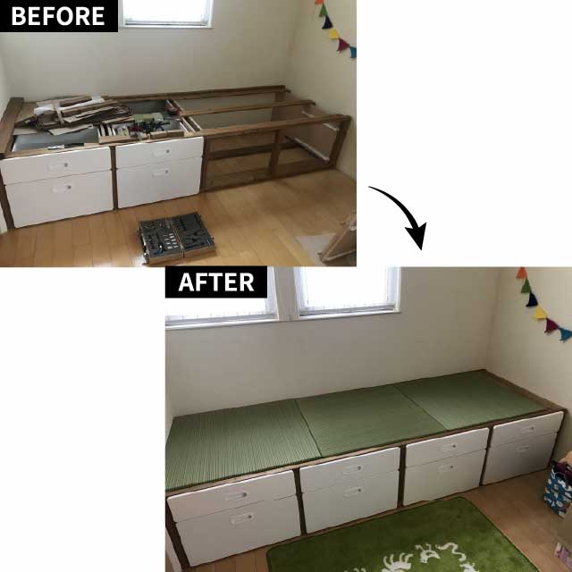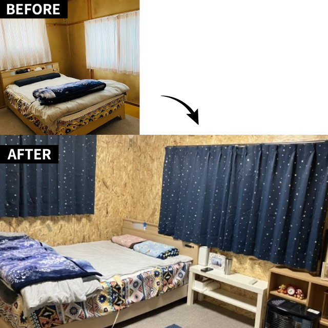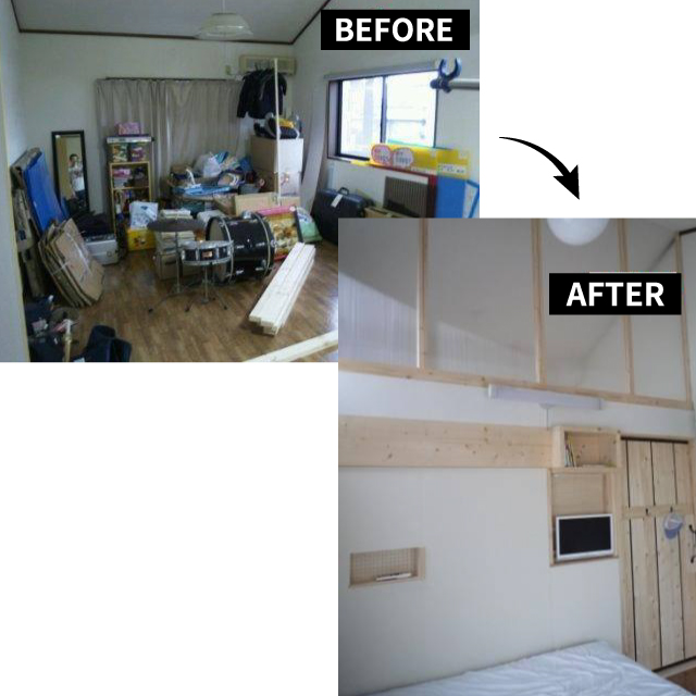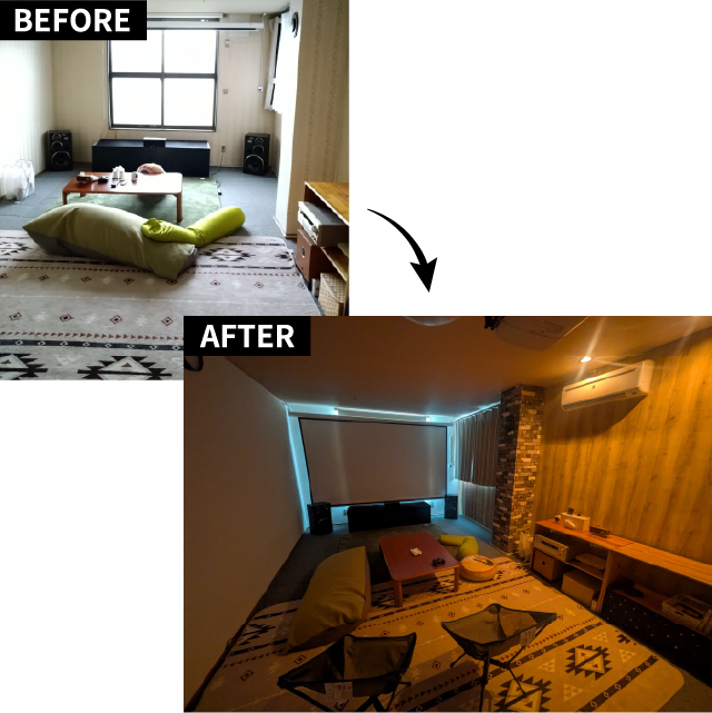 壁紙の経年劣化が目立っていたので思い切って張り替えしてみました! 貼り替え後、エアコンも取り付けてもらい涼しくなって更に快適になったお部屋!! これでゆっくり映画でも~と思っていたのに、 子供が友達を連れてきてすっかり溜まり場に笑 私も子供達もお気に入りの1部屋になりました♪