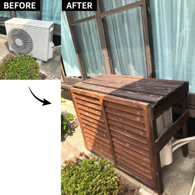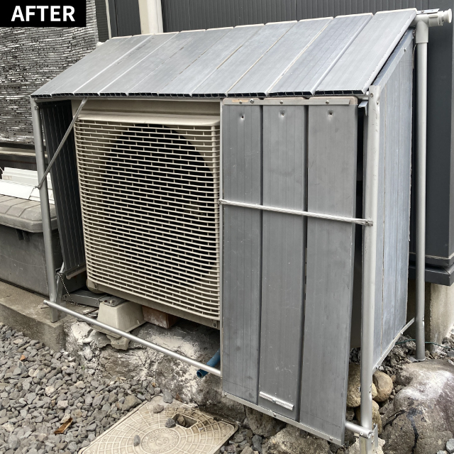 エアコン室外機の省エネ対策の日よけは売っているが、たたきの傾斜、配管を避けたり、市販品で会うものがないので、DCMのベランダの目隠し部材と垂木を購入して作りました。通風性と住宅との親和性が気に入ってます。家にある6台の室外機の夫々に合わせて寸法を出し、夏は簾とマッチしていい感じです。