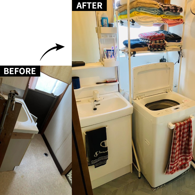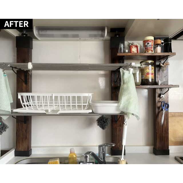 ラブリコでカンタンにシンク上をスッキリ見せられようにしながら、小さなものもおける棚を横に作り、水で濡れる部分は木を使わないなど機能性と耐久性も考えました。