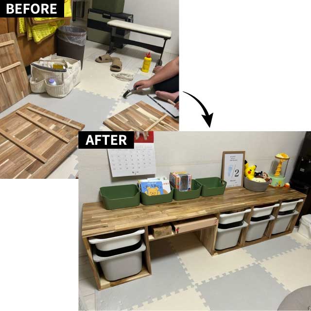 DCMのアカシア材とIKEAの引き出しで作りました! 子供が使いやすく、丈夫に作りました。