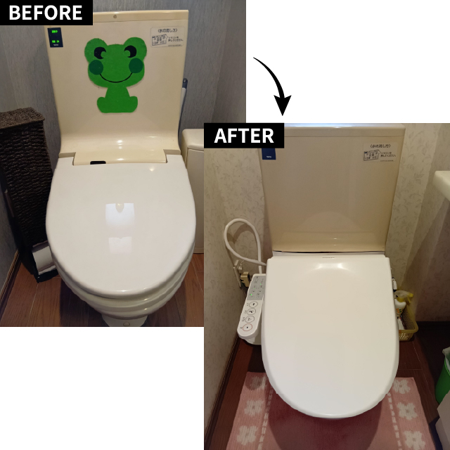 トイレの温水便座が故障、古い為修理も出来ないのでDIYでチャレンジ。一体型で取り付けが無理と思わたが、取り付けに成功。