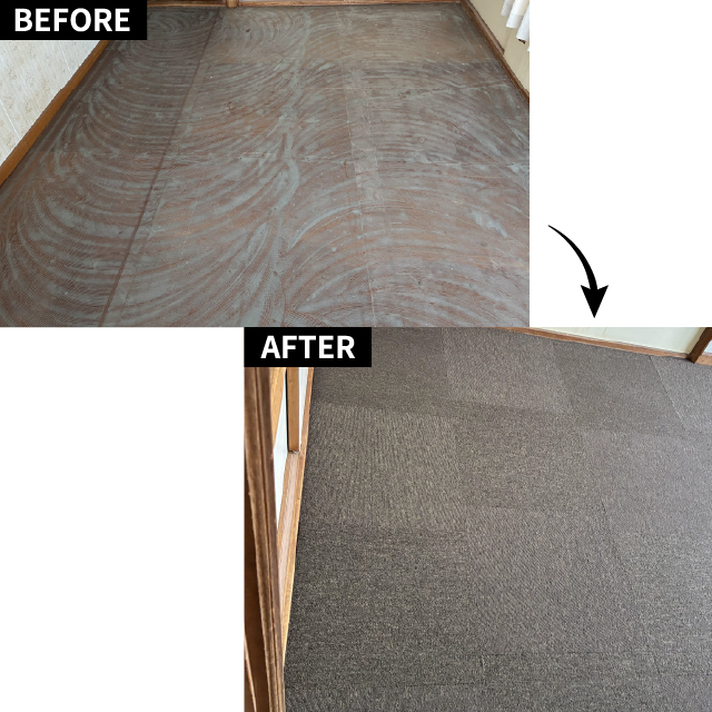 畳を撤去し、根太を均等に打ち付け、断熱材の発泡ウレタンボードをはめこみ、ベニヤ板をビスで固定し、大理石柄のフロアタイルを貼り、洋室にDIYをしました。