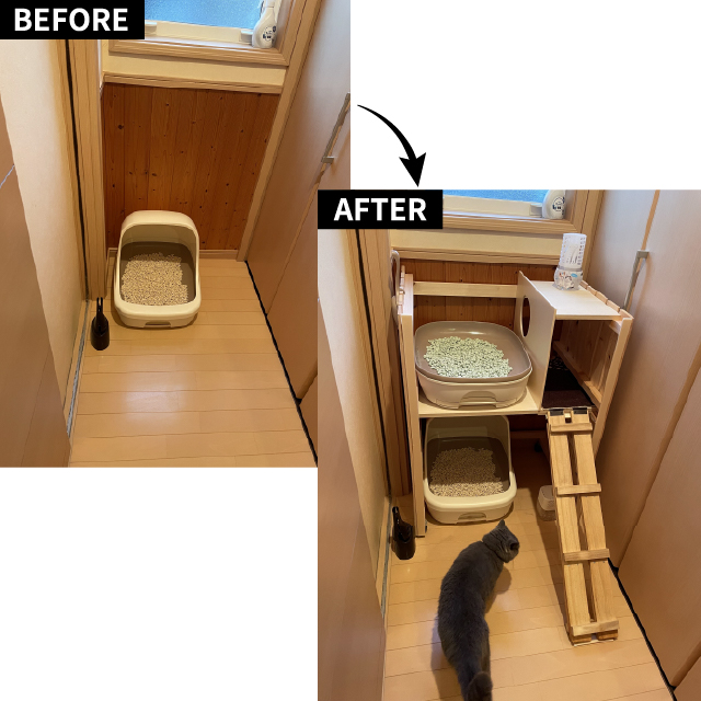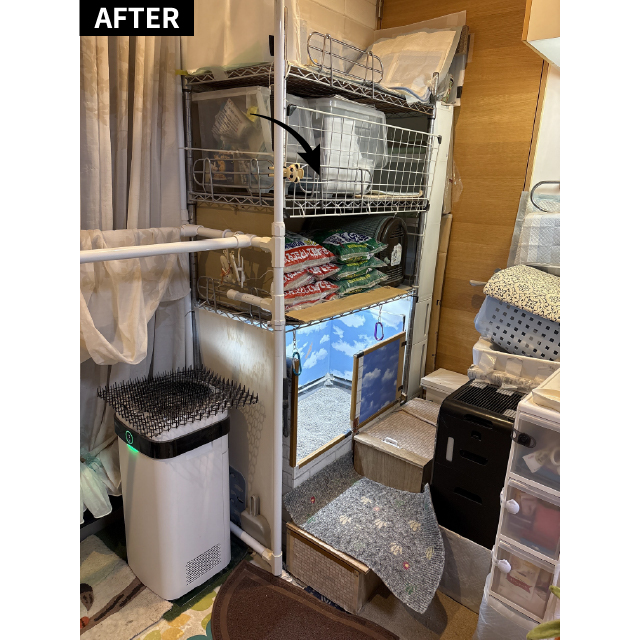 大勢のため市販にない大きなトイレをプラスチック化粧箱で作り、雲のクロスさわやかにスチールラックで猫砂、シーツ置場、踏み台下はバケツがあり、前扉が開き糞尿が片付けやすくしてあります。