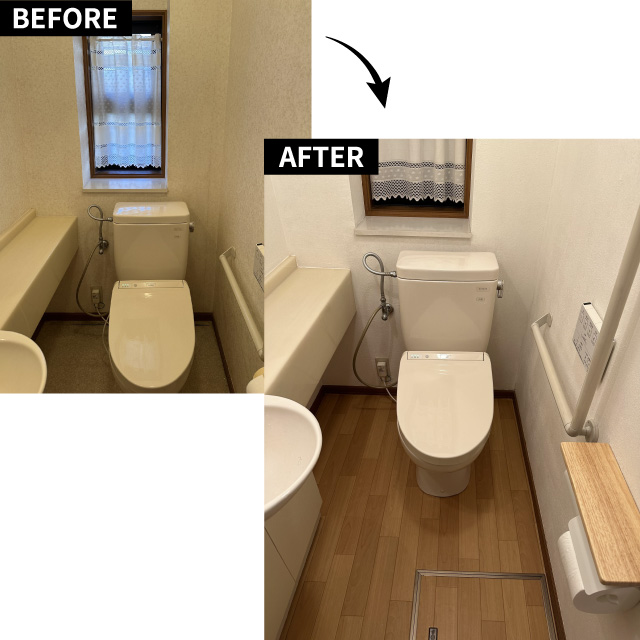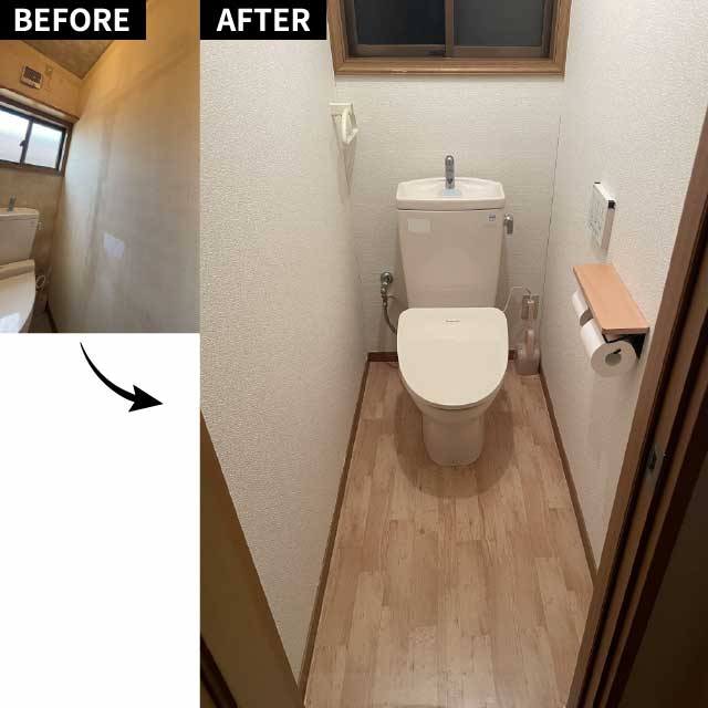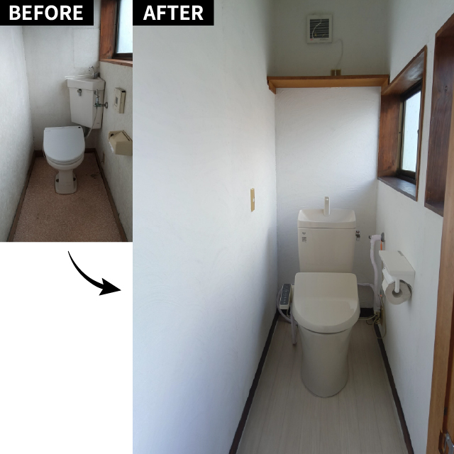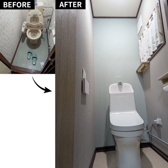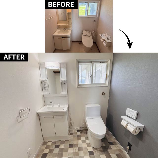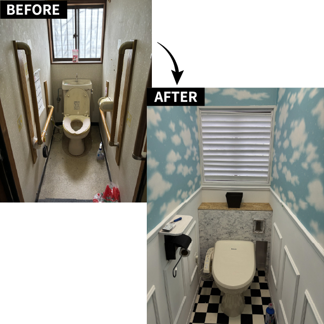 トイレの故障をきっかけに内装も一緒にリフォーム。娘と一緒にDCMで沢山のクロスとクッションフロアからチョイスしました!おかげで明るいモダンな雰囲気になり娘も大喜び。