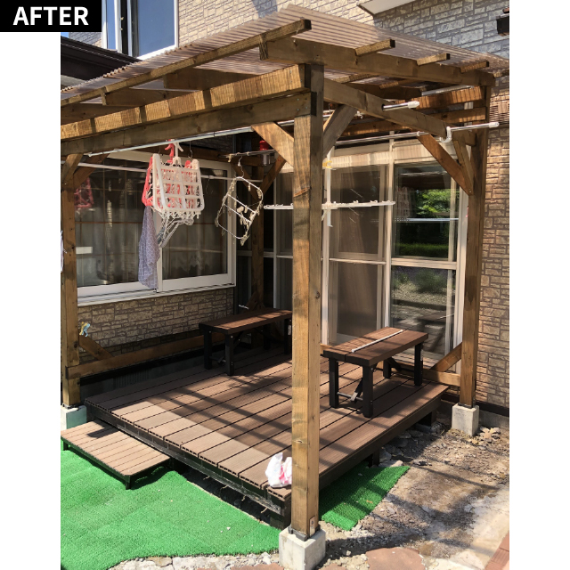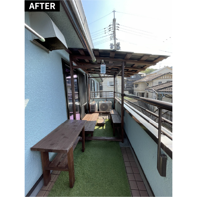 ベランダでバーベキューがしたくて 屋根・縁台・テーブル・ベンチを2×4で DIYしました。が…猛暑の為、屋根付き物干し場となり、縁台はワンコの昼寝の場所となってます。