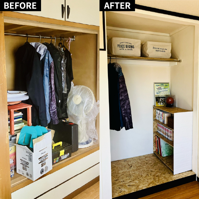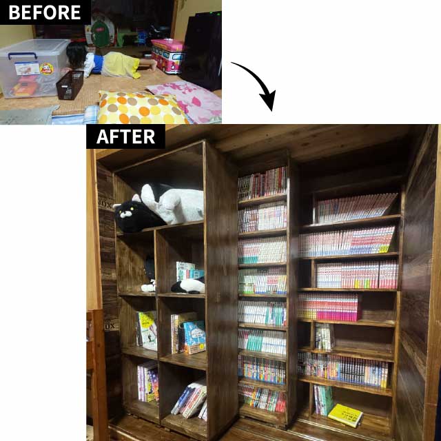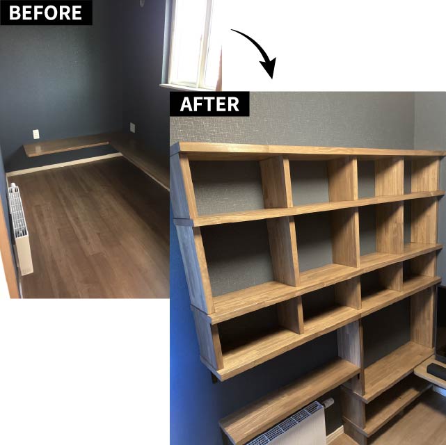 クローゼットを壊して作ったスペースでしたが、子供の成長に合わせて再び部屋を仕切ることに。子供の希望で娘と一緒にスライド本棚をDIYしました。パイン集成材の木目を活かし落ち着いた色味に仕上げました。上下にキャスターを使うことでスムーズな動きを実現しました。