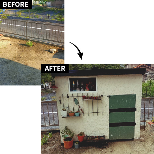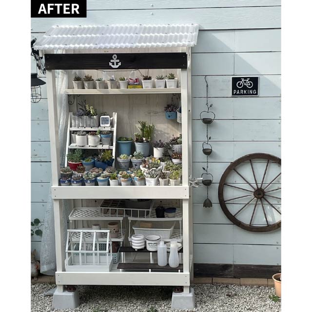 多肉植物を飾る壁を作るつもりが、台風対策を考えてる間に小屋を作ることに。モルタルやスタイロフォーム等、初めて触る物ばかりでしたが楽しく作業出来ました! 室内にはガーデニング用品を入れています。