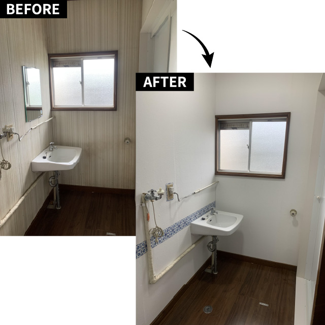 壁と天井をクロス張替え。 ライトはマリンライトに交換。 床は白系のストーンタイル。 壁下は腰壁風にアクセントでレンガ調にし、 壁上部はシンプルで1番白みのある壁紙をチョイス。 天井は白木の壁紙でマリンライトを付け、全体的に北欧風を目指し仕上げました。