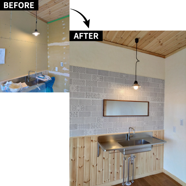 DCMでDIYのアドバイスを頂きながら無事に完成! タイル貼りも漆喰塗り塗りも大変でしたが自作に満足してます。 漆喰の色もパイン材の天井と相まっていい感じ! タイルもMade in イタリーで素敵な空間になりました。