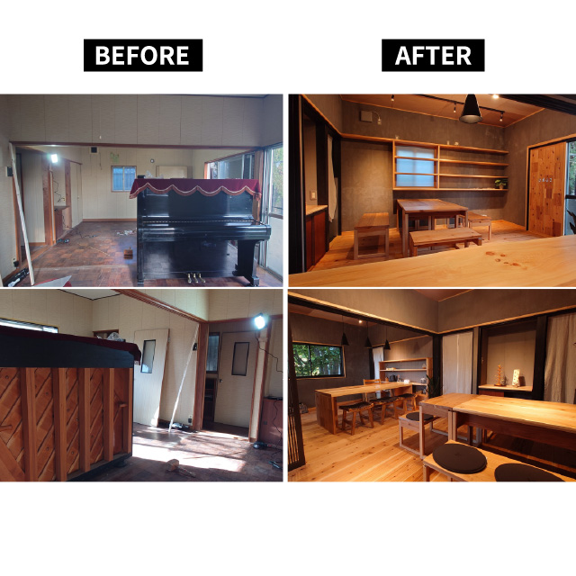 杉板を何十枚も使って、床、棚、カウンター、ベンチなど製作。余った木端を無駄にせずパッチワーク的に建具やテーブルの脚に。 倉庫になっていたスペースを片付けて、ギャラリー風、みんなの集える「toko」を造りました。