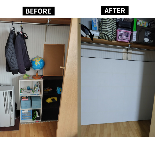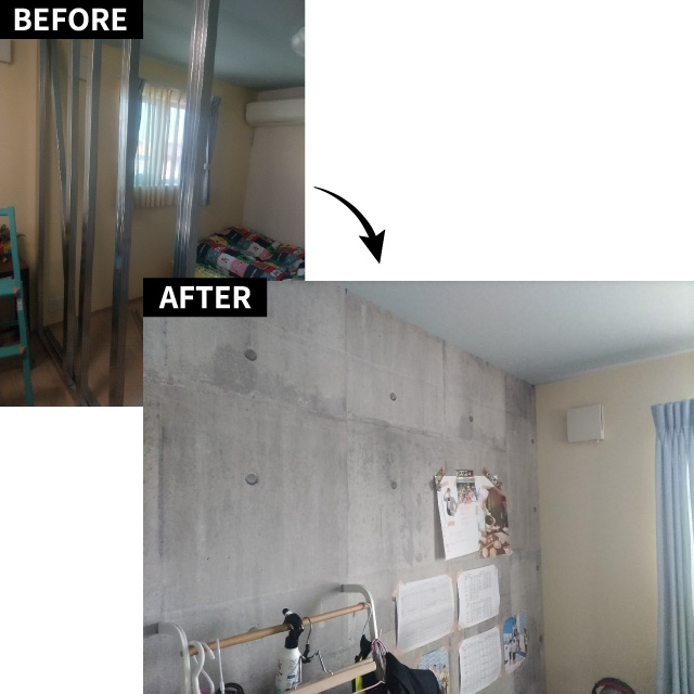 子供部屋の押し入れサイズに合わせて1×4アジャスターで柱を設置し、それに貼り付けたプラダンの上に調湿壁材「さらりあ~と」を貼り合わせた疑似壁を作成しました。 元壁を加工せずに設置ができたので満足しています。