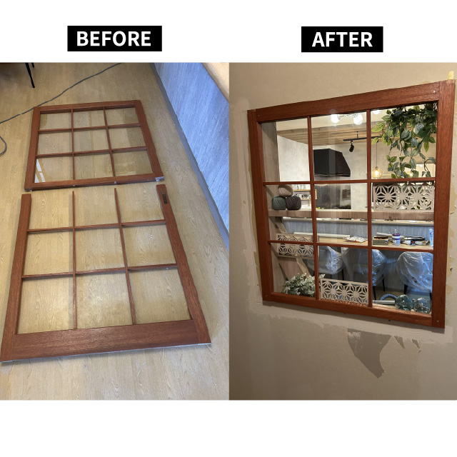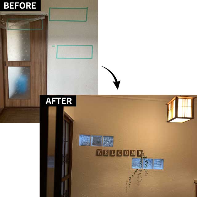 引き戸を撤去して、板を貼り壁を作成。 ガラスブロックの大きさに木枠を作りセメントで固めました。 壁にモルモルを塗り、乾く前に"WELCOME" のアルファベットを固定。 夜は奥のキッチンの灯りがガラスブロックに華麗に光ります。