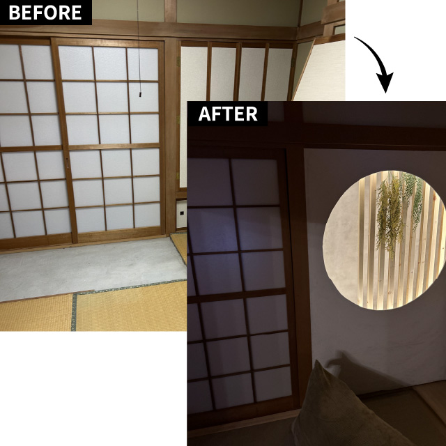 仏間の扉を取って解体。 奥に柱を立て、ベニヤ板に壁紙を貼り、手前のベニヤ板を丸く切り抜いて、モルモルを塗りました。 バックにLEDテープライトを貼り、アクセントに木材で格子を作りライトアップ、格子の影と壁紙の幻想的な照明がとても綺麗です。