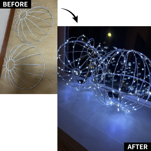 園芸用のワイヤープランターを白のスプレーでペイントして、イルミネーションソーラーライトを巻きました。 窓際に置いてますが、日が沈むと電気がキラキラ光ってとても綺麗です。