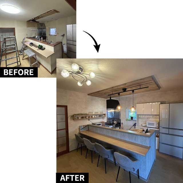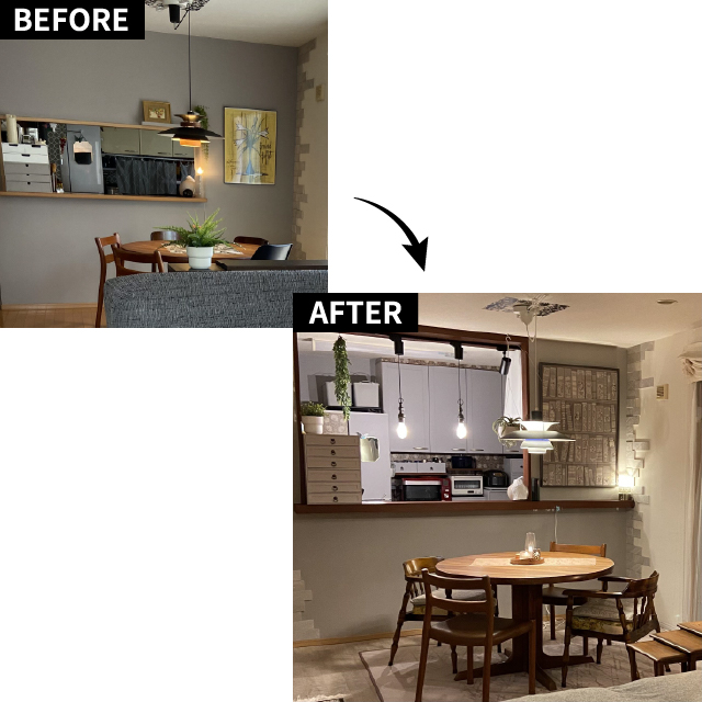 築22年、キッチンの収納扉の表面が剥がれてきたのをきっかけに夫婦でDIYを決行! 収納の扉は店舗で合板を50mm幅に大量にカットしてもらい、リメイクシートを貼って框扉に、キッチンカウンターも板を乗せて延長、吊り戸棚を撤去してダクトレールと照明を取り付けたら、憧れのオープンキッチンが出来上がりました。