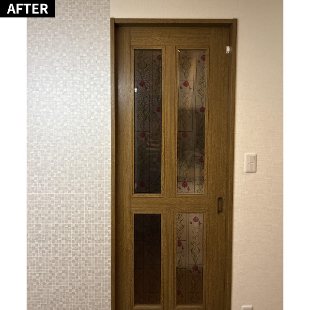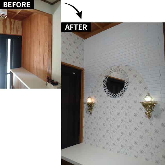 壁を木から花柄の壁紙へ変更、ブロック状の立体感のある壁紙を使用し、さらにア-チ状にカットする事でイギリス風の素敵な玄関に変貌しました。
