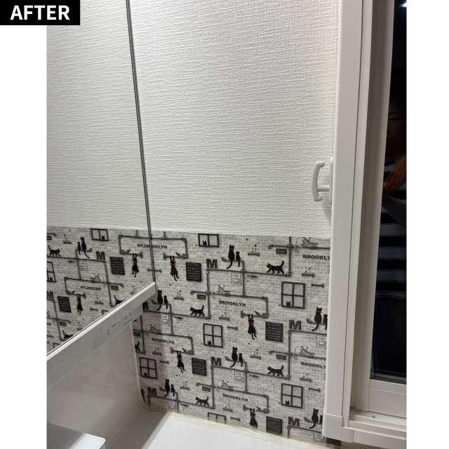 3才の孫たちが楽しく手洗いできることを願って。「クロスの上から貼れる」とありましたが、でこぼこなクロスの上から貼るのは、大分苦労しました。白の壁紙は生のリを付けてもらってきれいに貼れました。」