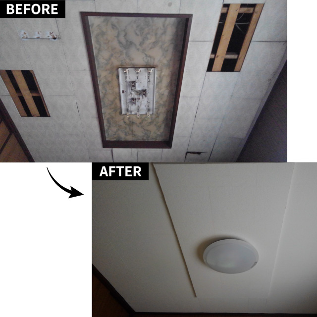 実家の天井をリフォームしました。天井下地に合板を張り、壁紙を貼ってシーリングライト取り付けで完了