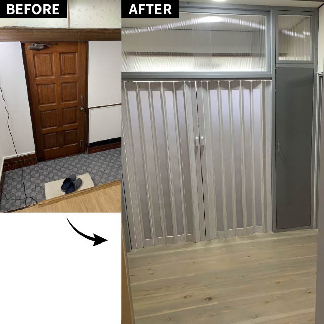 玄関にアコーディオンドアで仕切ることで冷暖房効率が上がりました。