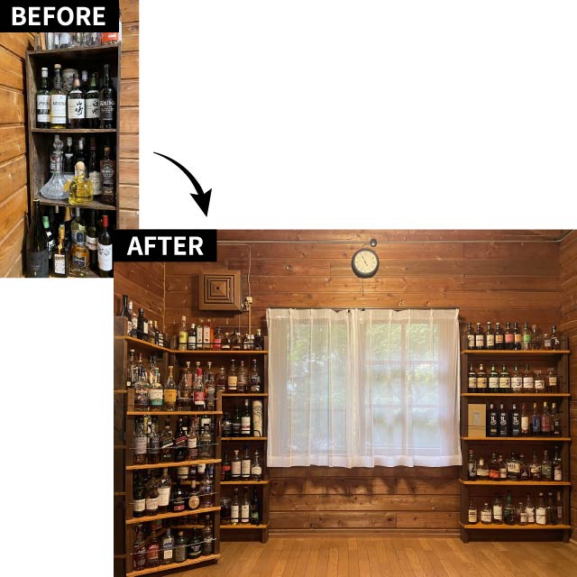 ウイスキーのボトルがちょうどフィットする市販の棚がなかったので、DCMで木材と金具を買って、自ら設計、木材の切断、色塗り、組立、設置をしました。自作の棚を見ながらウイスキーを飲むのが至福の時間になりました。