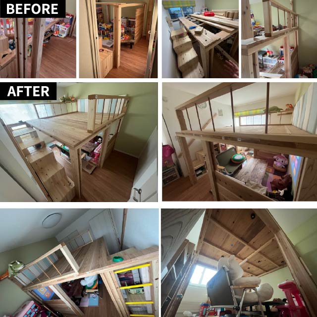 子供部屋を有効活用するために、ロフトベッドを制作しました。 ロフト下では秘密基地のように遊ぶこともでき、シアター設備も完備しましたので家族揃って映画鑑賞もできるようになっています。