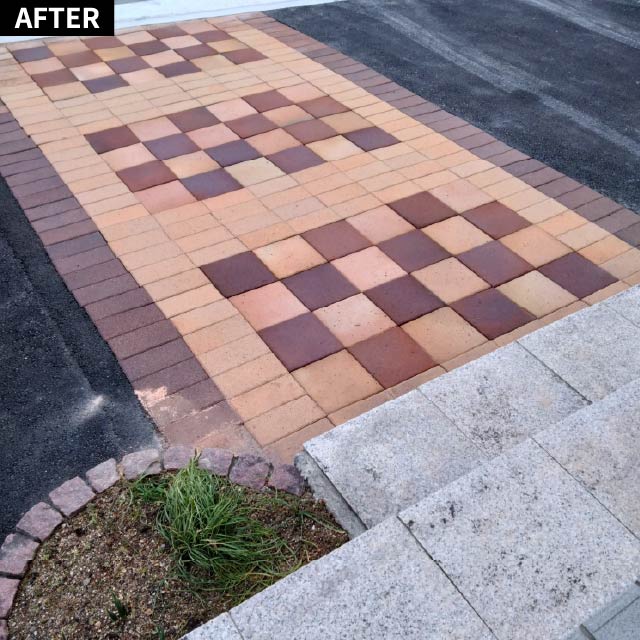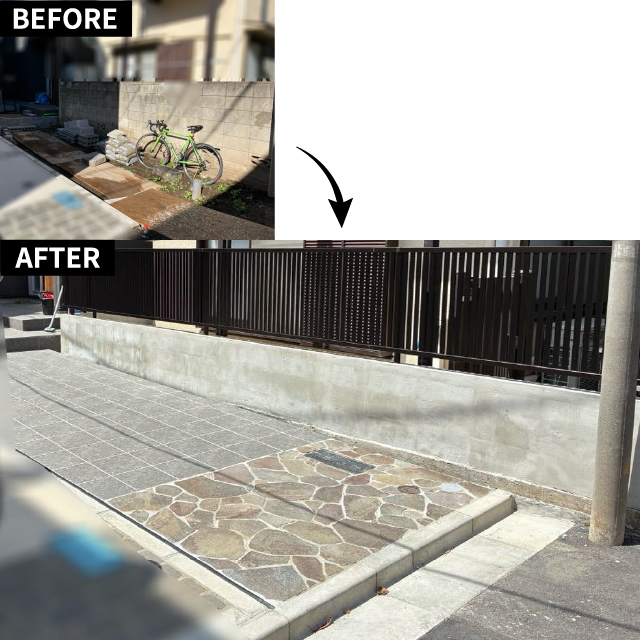 駐車スペースにアスファルトを敷くことになりましたが、全面アスファルトに白線は殺風景なので、駐車可能なアプローチを作りました。1台分の幅にしたので、駐車時の目安にもなっています。