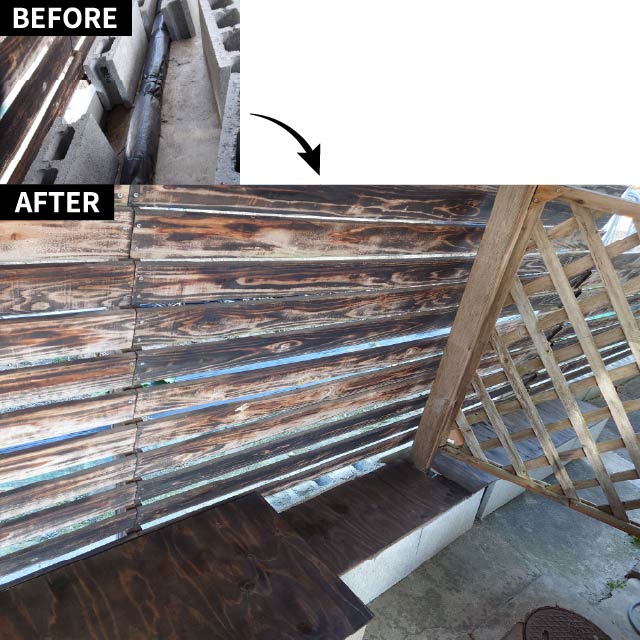 水道の給水パイプがむき出しの為、凍結防止対策をしました。パイプは余ってた防草シートを結束バンドで巻き、両側にブロックを設置。隙間にはスタイロフォームを敷き詰め、上に針葉樹合板を置き、木部保護ペイントのブラックで仕上げました。見た目もスッキリしました。