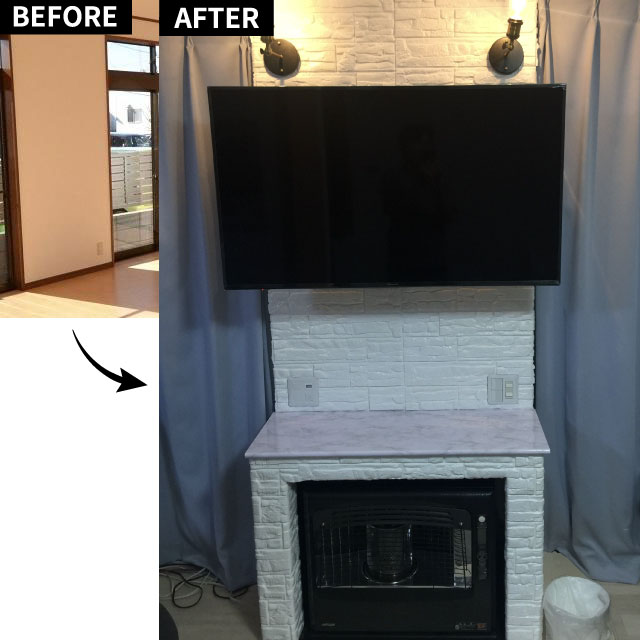 アンティークストーブを仕舞う時、重くて大変で困ってました。そこで、置きっぱなしにする為に暖炉風の家具を作りました。ついでにテレビを壁掛けにしました。