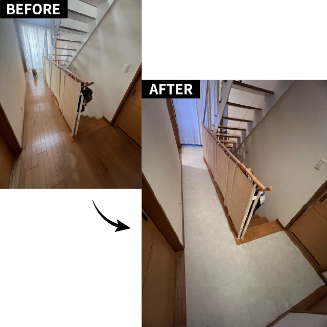 玄関から続く廊下が、クロスも傷み汚れ老化して暗いので、明るい色の漆喰で塗ってみました。何度かに分けて廊下から階段まで塗り終わりました。ドアと照明も変え、思っていたより明るくなって良かったです。