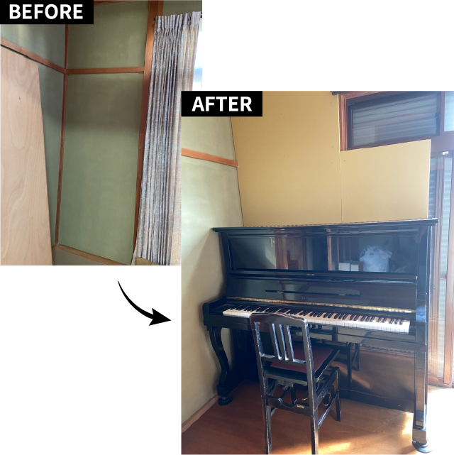 リビングに置いてあったピアノを広縁に移し、家族に気兼ねなく弾けるようにしました。ピアノの後ろが一部窓になるため 壁(黄色)を作りました。緑の土壁は劣化がひどかったため 店員さんが薦めてくれたアサヒペンの土壁抑えを2度塗りしました。