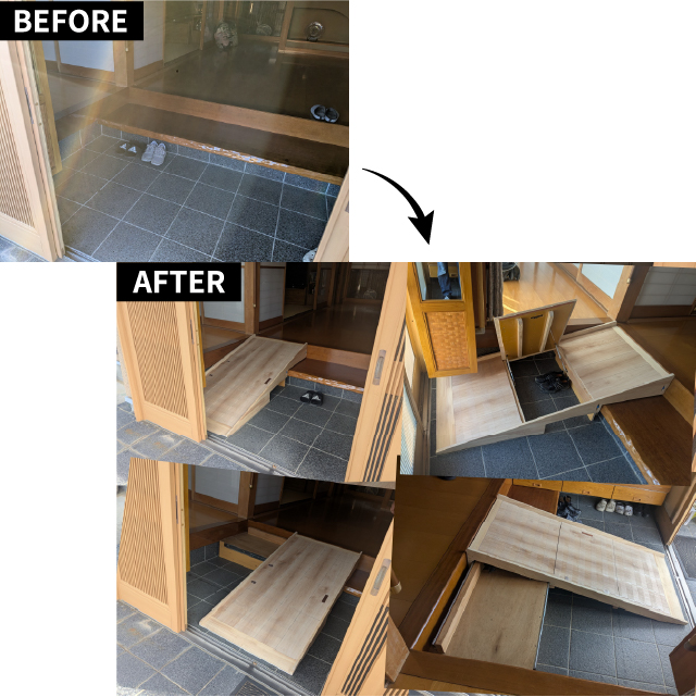 母親の介護を機にスライド式スロープを作成しました。 普段は玄関の隅に置いておき、使うときだけスライドしてセットして使います。 ロック付きスライドレールを使うことでロックできるため安全に使えます。 また、木目を活かすため、透明の滑り止めテープを使っています。 デッドスペースには開閉式の下駄箱(物入れ)を作成しました。