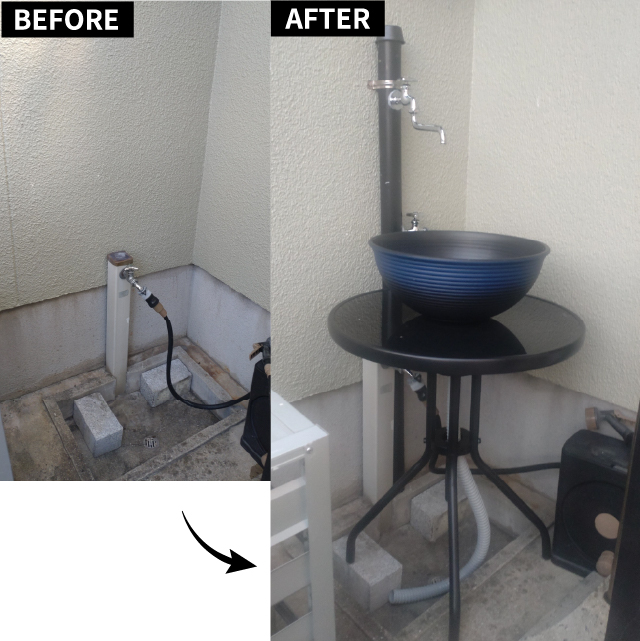ステンレスのガーデンシンクでは無く、手作り感のあるデザインを考えました。ガーデンテーブルのパラソルの穴を利用し目皿、排水ホースを取り付けました。 既存の立水栓では無く、オリジナルで考えました。