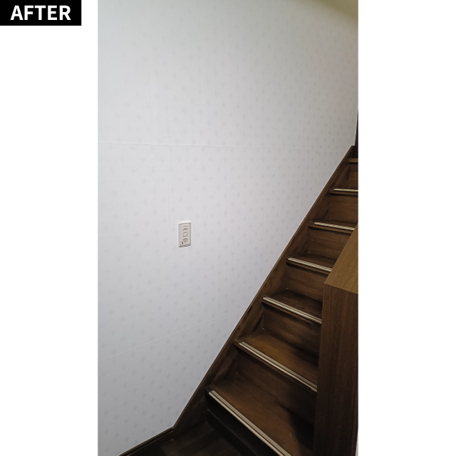 リビングの壁紙リフォームを行い、うまくいったので玄関と階段周りもやってみました。壁紙のアクセントにモールディング板も付けてみました。