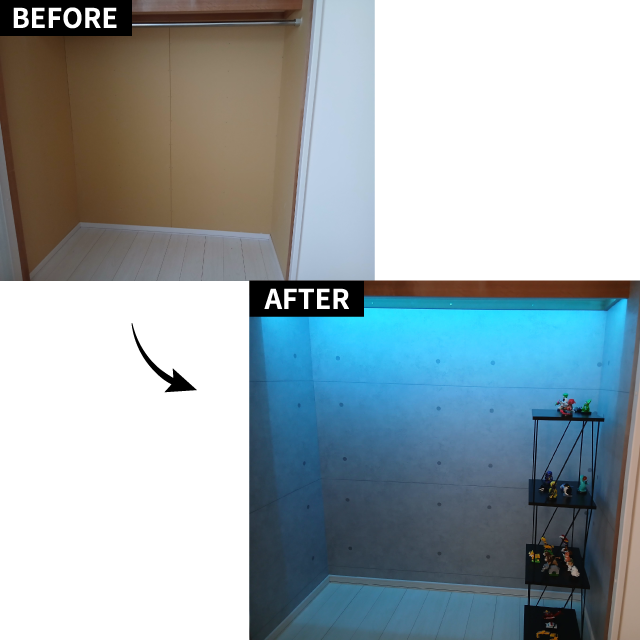 息子が大きくなり、部屋を広くしたいという希望からウォークインクローゼットの扉を外しました。石膏ボードに壁紙で秘密基地のような空間を作りました。DCMの親切な店員さんに、練習させてもらったおかげで、継ぎ目部分もキレイに張ることができました。コンクリート調の壁紙にはラインがあり、合わせて張ることが難しかったですが、とても楽しく作業できました。息子も想像以上の出来にとても喜んでいます。