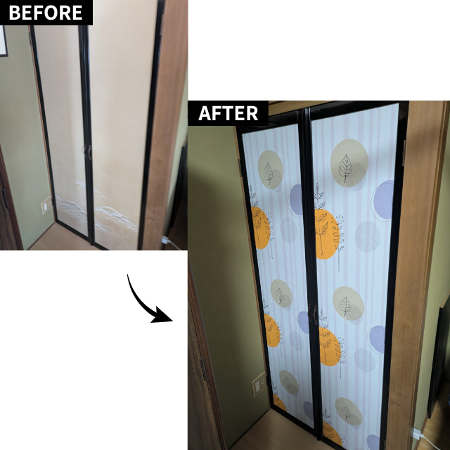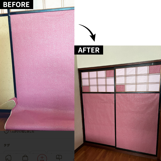 昭和感な襖を明るい好きな色の壁紙でリメイクしました。ラメが入っており和室にすごく合っていて、部屋が明るくなりモチベーション上がります
