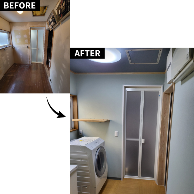 作品名:自分で伐った木とデニム壁紙で。壁をぶち抜き、家事動線を一新させた洗面所劇的大改造!