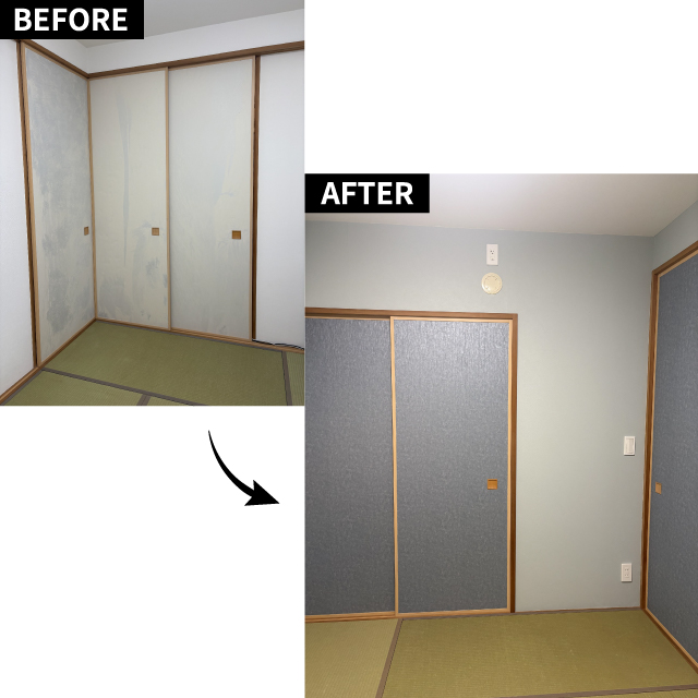 最初は襖の張替えのつもりが、襖の色に合わせて天井以外の和室の壁紙をブルー系に統一して、落ち着いた印象の和室になりました。 襖や壁の角や段差の部分をカットするのが難しかったですが、色々教えていただきながら少しずつ上達出来たと思っています。