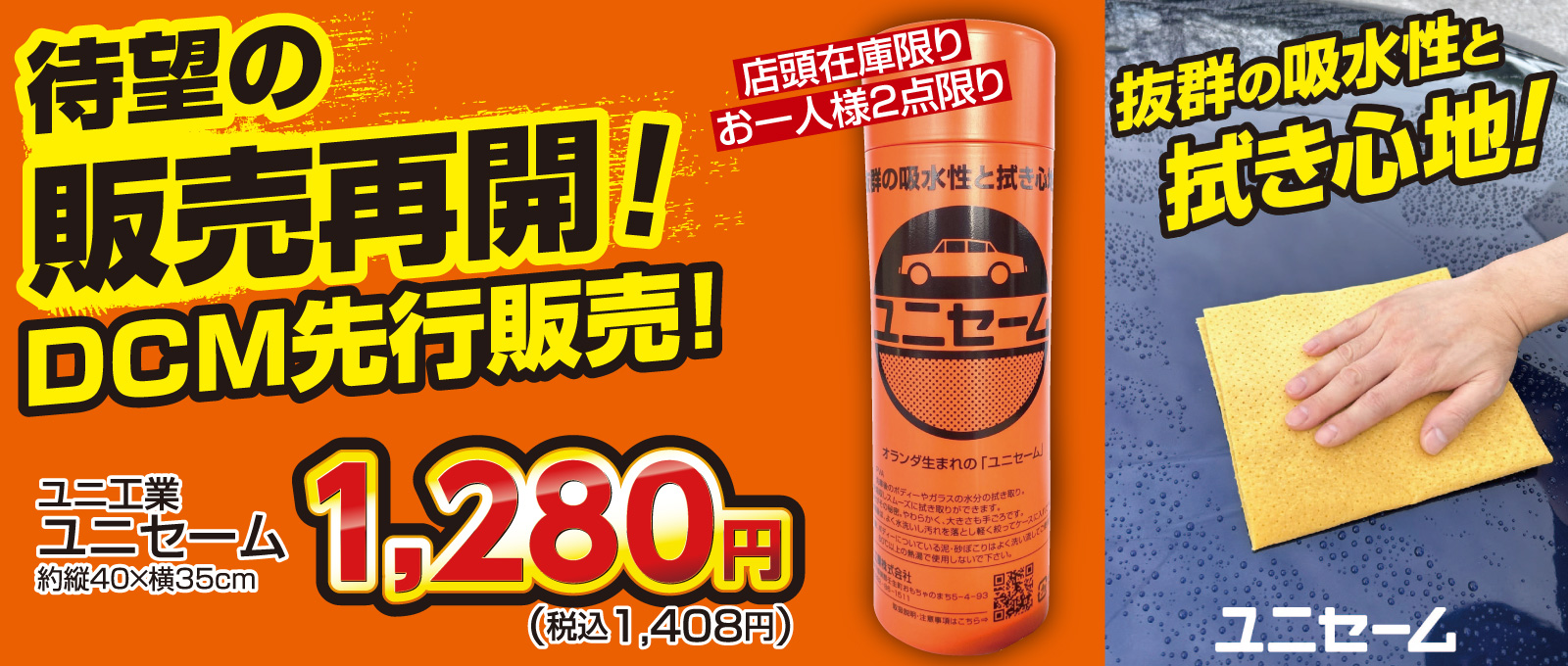洗車後の水分拭き取りといえば!の「ユニセーム」を、店舗・数量限定にて販売再開いたします。