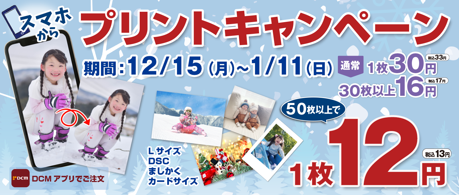 DCMアプリからスマホのデータを写真プリントできるサービス「スマホプリント」にて、期間限定のお得なキャンペーンを実施中!通常料金1枚33円(税込)のところ、キャンペーン期間中は50枚以上のご注文で1枚13円(税込)!※1回のご注文で50枚以上同じサイズに限ります。2026年1月11日(日)までのお得なキャンペーンですので、ぜひこの機会にご利用ください♪事前にアプリからご注文いただき、DCMの店舗にてお受け取り・お支払いができます。
