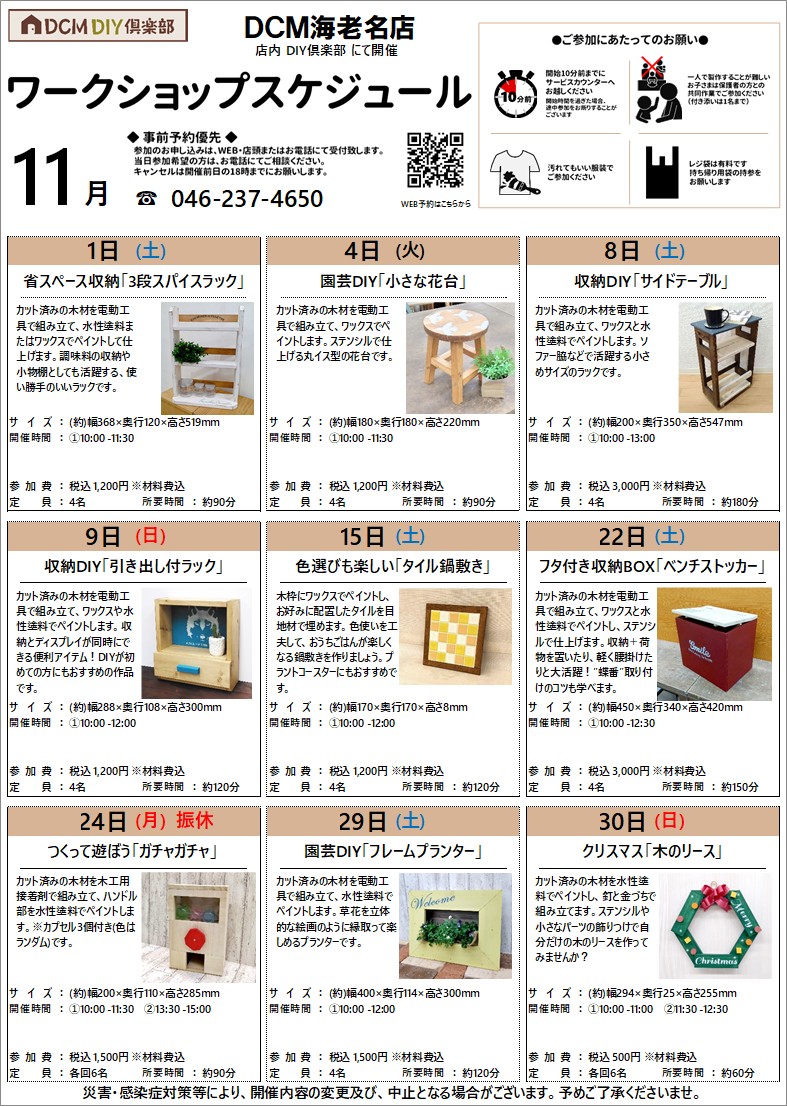 『11月のDIY教室スケジュール(海老名店)』のご案内