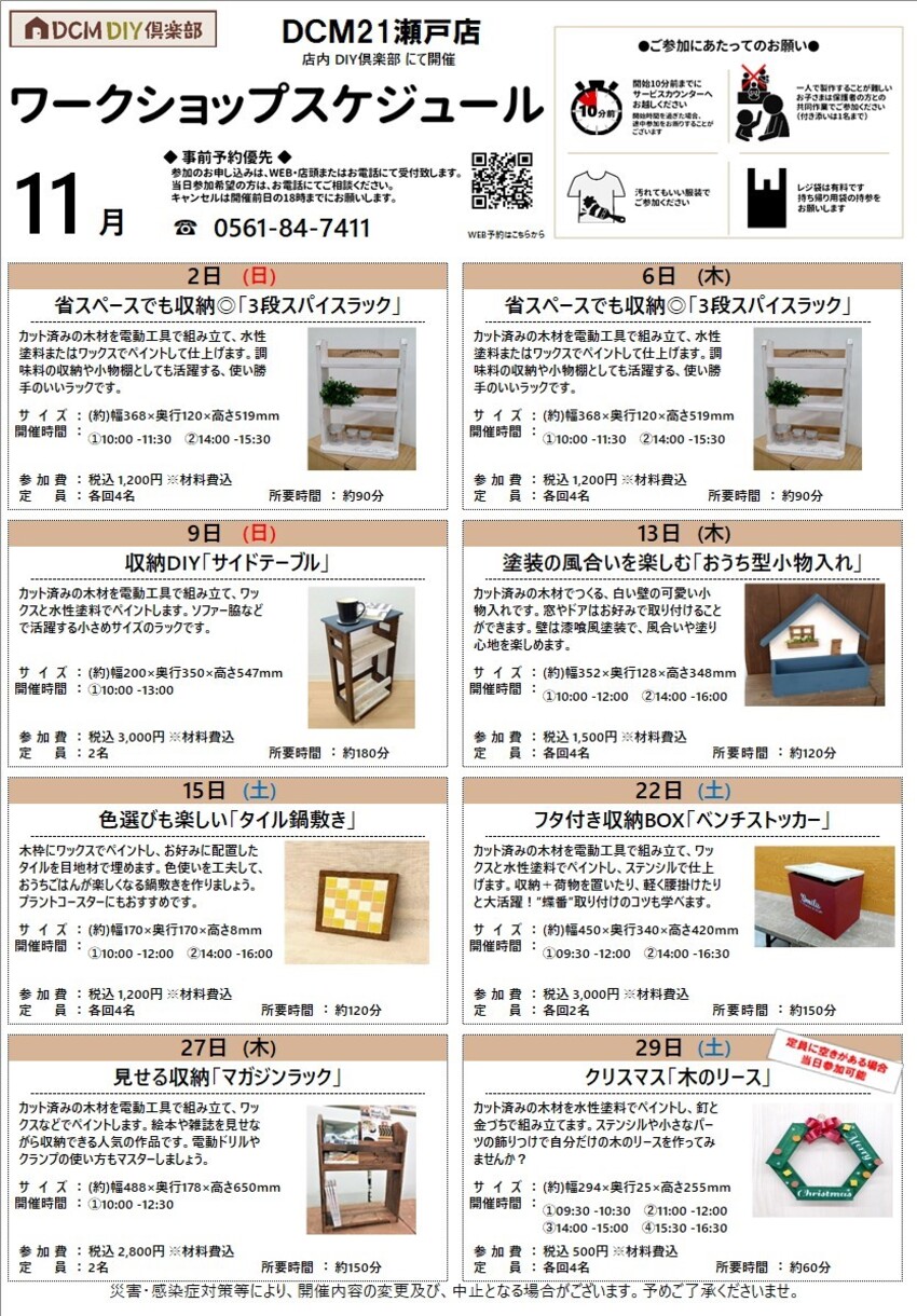 『11月のDIY教室スケジュール(瀬戸店)』のご案内