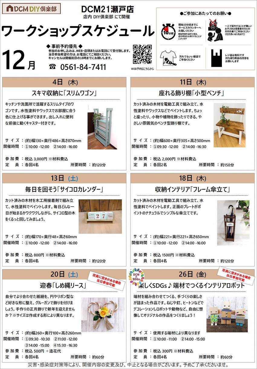 『12月のDIY教室スケジュール(瀬戸店)』のご案内