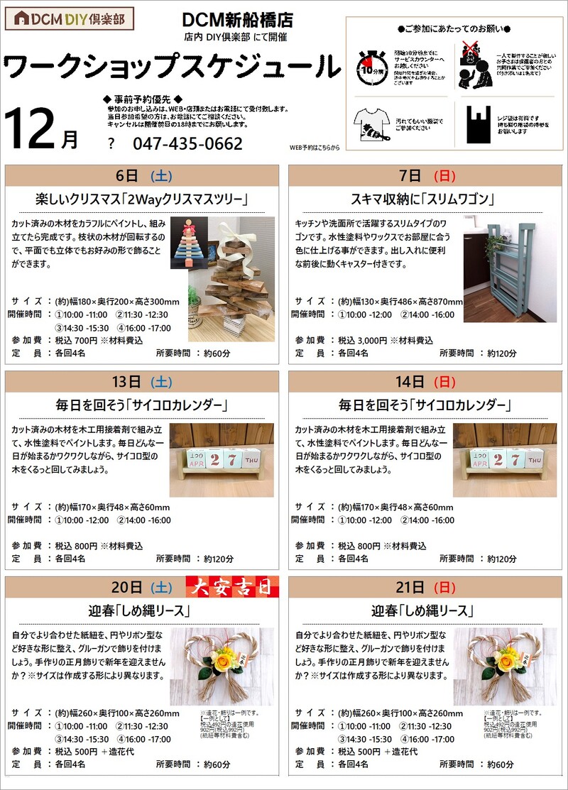 『12月のDIY教室スケジュール(新船橋店)』のご案内