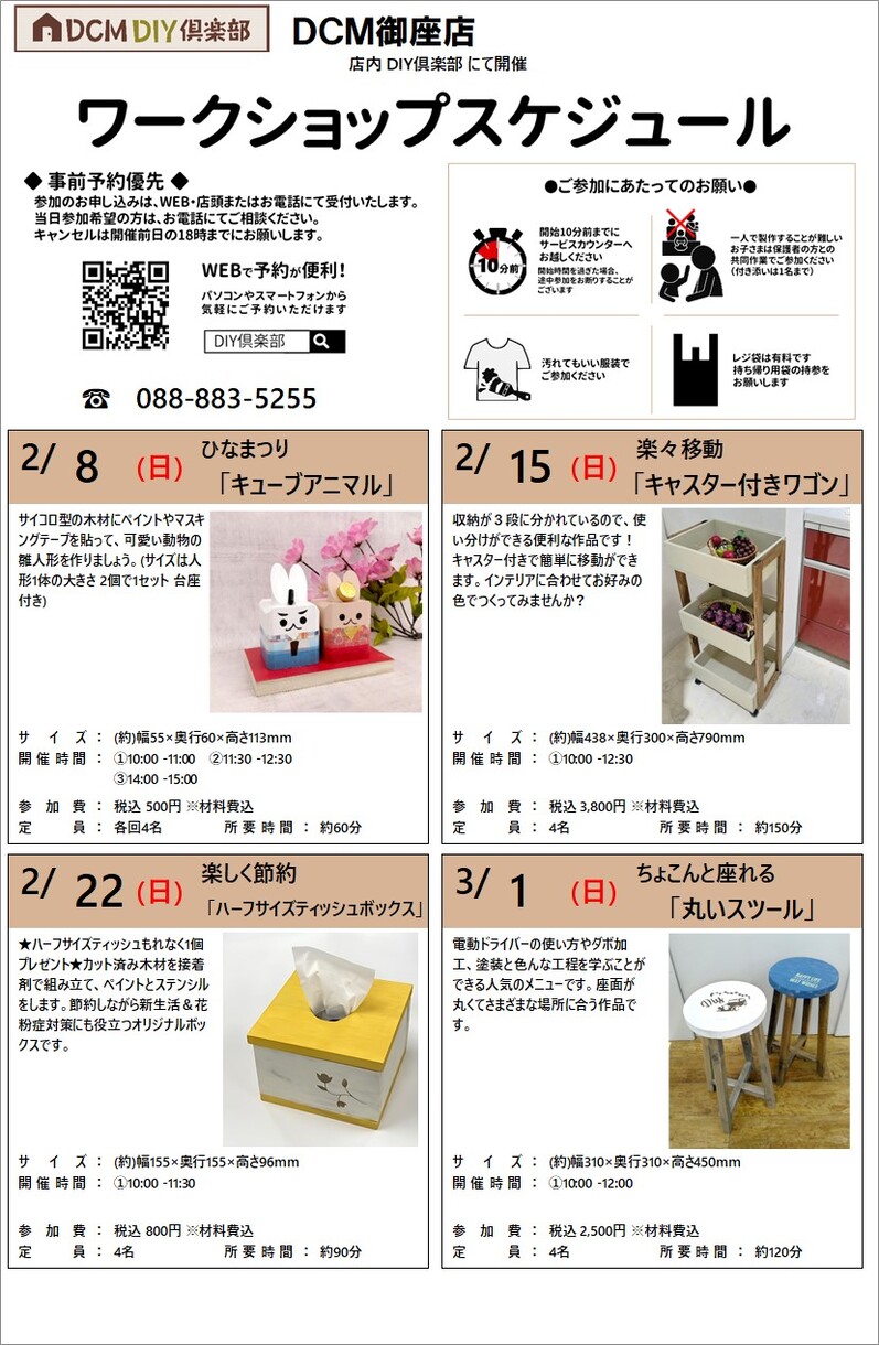 『2月のDIY教室スケジュール(御座店)』のご案内