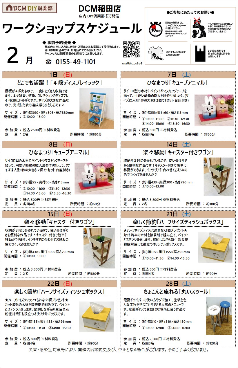 『2月のDIY教室スケジュール(稲田店)』のご案内